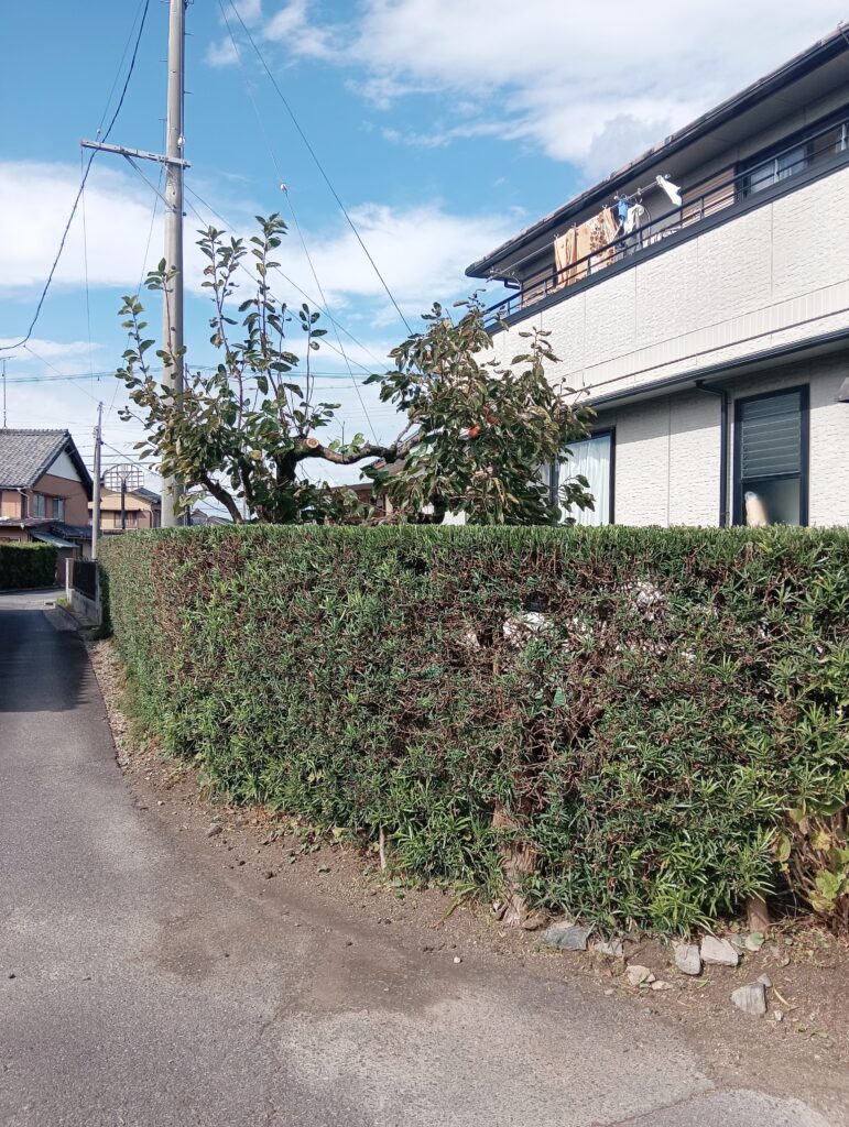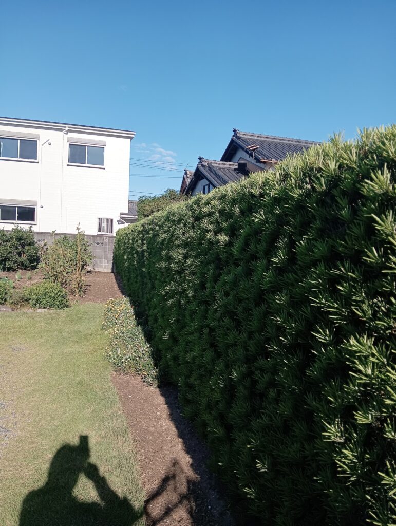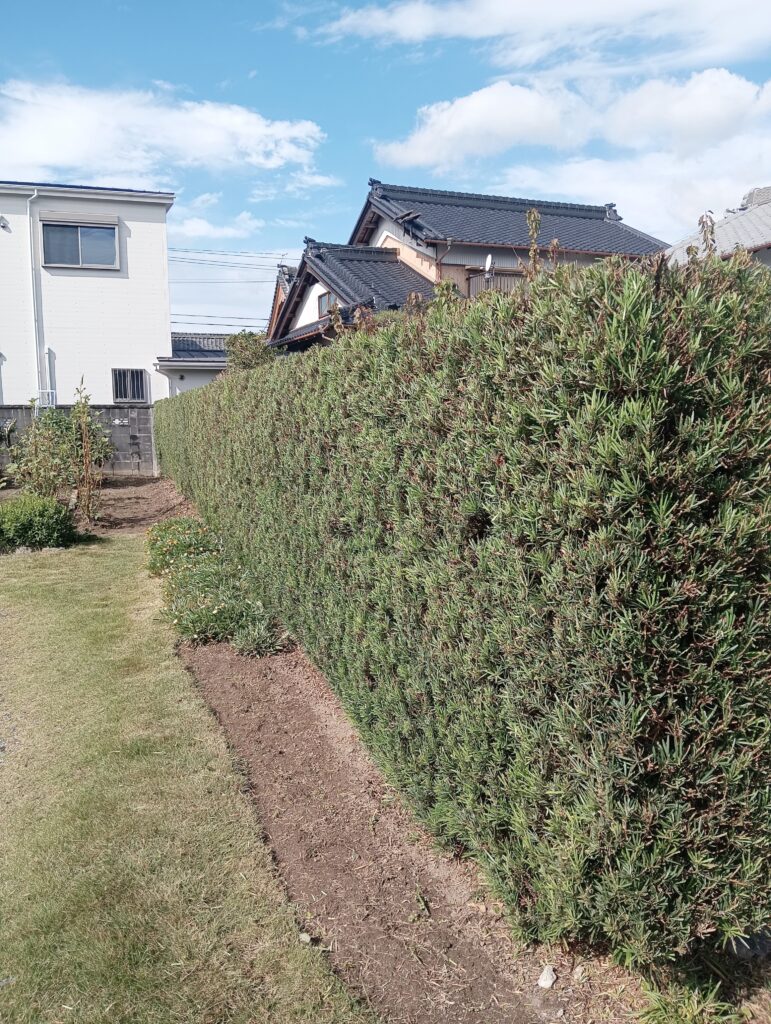 岡崎市にて、イヌマキの生垣の刈り込み、ラカンマキの生垣の刈り込み、カキの切り詰め作業をさせていただきました。