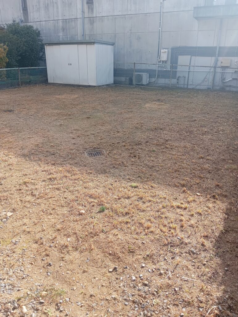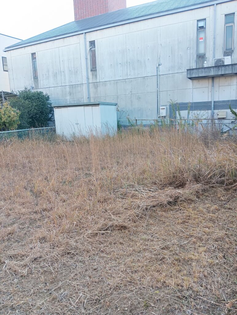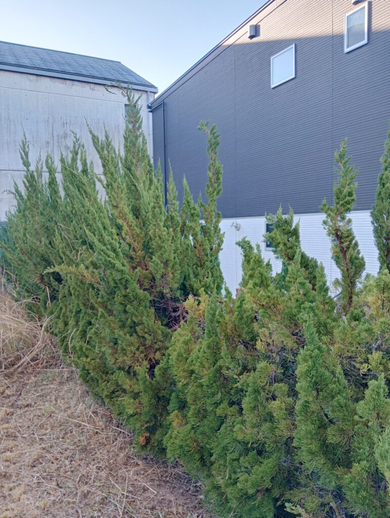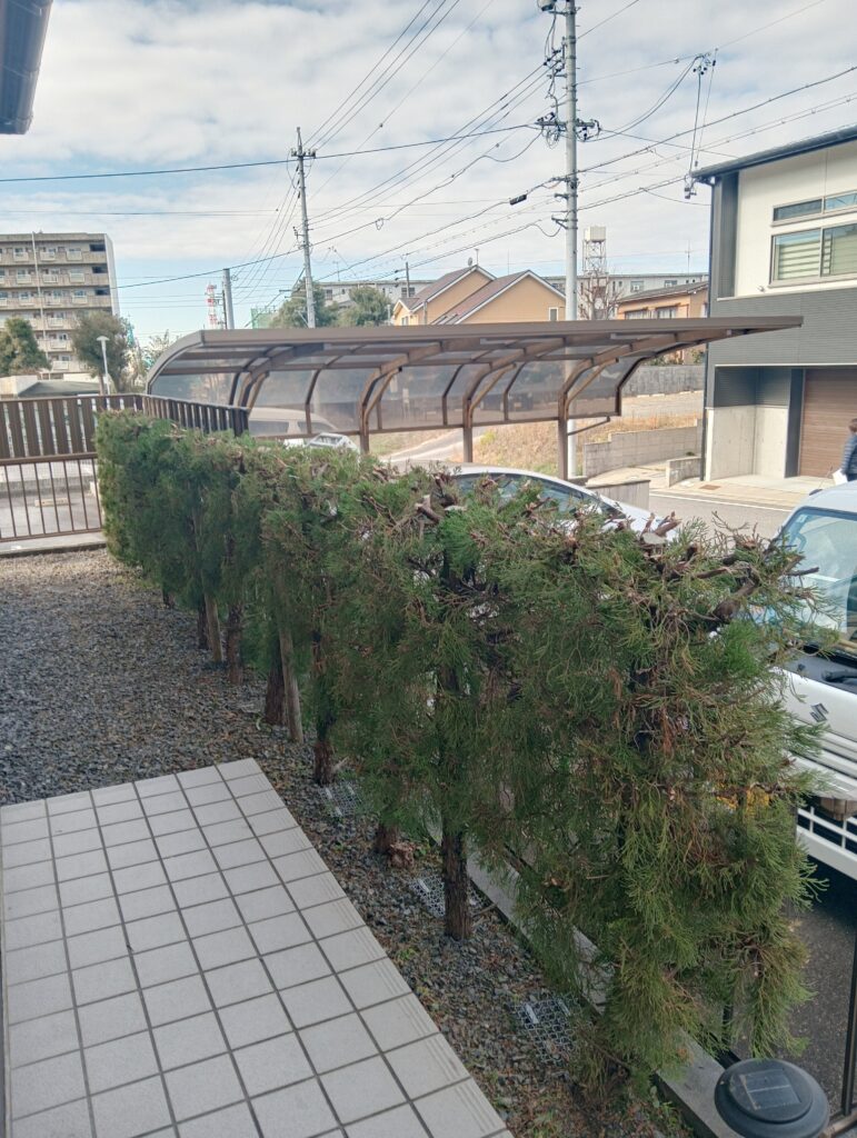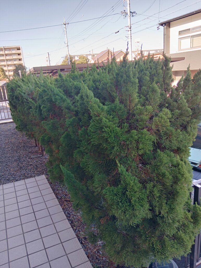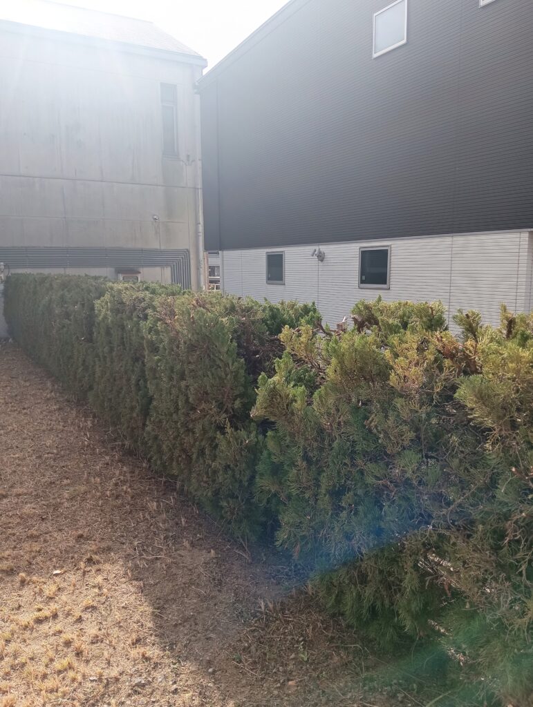 岡崎市にて、カイヅカイブキの生垣の刈り込み、草刈り、低木の剪定、スギ(枯れ木)の伐採作業をさせていただきました。